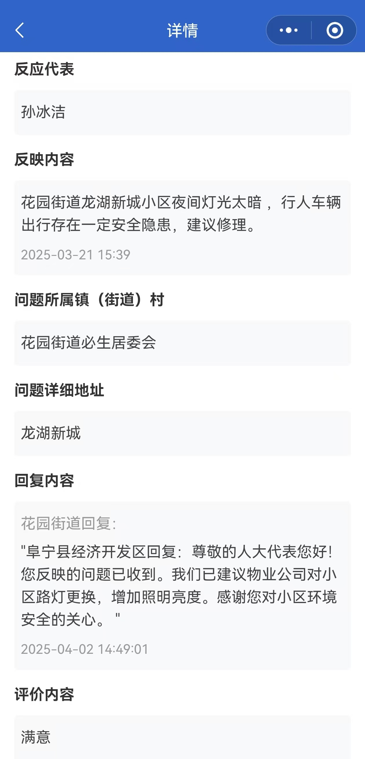 民生会客厅是人大代表聚焦群众急难愁盼,搭建的常态化沟通平台,通过线上线下融合方式收集民情、解决民忧。在“阜宁人大代表云家”微信小程序的“安全环保随手拍”界面上,问题处理进度正实时更新——住在龙湖新城小区的代表孙冰洁反映“小区路灯昏暗影响出行安全”,该事项从“待处理”快速转为“已评价”,物业公司及时更换路灯。目睹整改成效的居民施老先生点赞道:“现在打开手机就能‘晒问题’,人大代表们比我们还上心!”