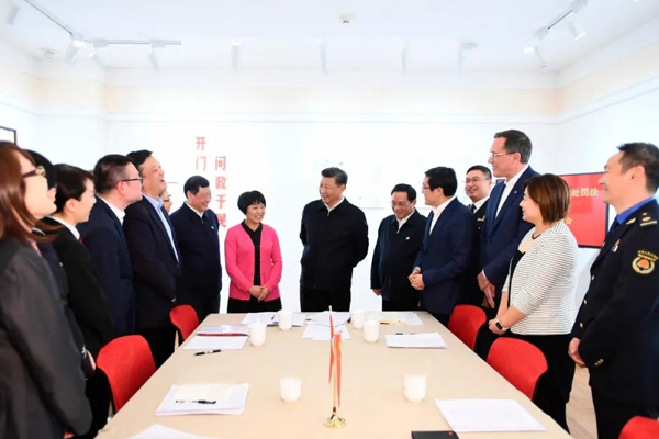 2019年11月2日至3日,中共中央总书记、国家主席、中央军委主席习近平在上海考察。这是2日下午,习近平在长宁区虹桥街道古北市民中心,同正在参加立法意见征询的社区居民代表亲切交流。摄影/新华社记者 谢环驰