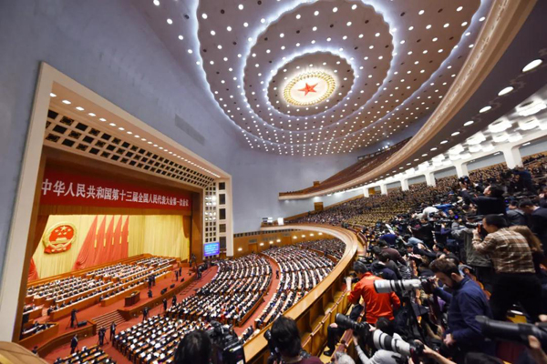 2018年3月17日,庄严的人民大会堂,国徽高悬,耀眼夺目。
