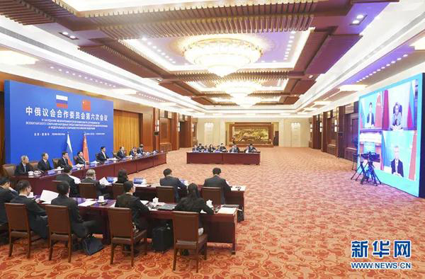 2020年11月2日,全国人大常委会委员长栗战书在北京人民大会堂出席中俄议会合作委员会第六次会议视频会议开幕式并致辞。摄影/新华社记者 刘卫兵