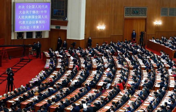 2021年3月,十三届全国人大四次会议通过新修改的全国人大组织法,明确规定全国人大及其常委会“坚持全过程民主”,为中国特色社会主义民主的实践提供了规范的法律依据,推进人民代表大会制度完善发展,更好保障人民当家作主。