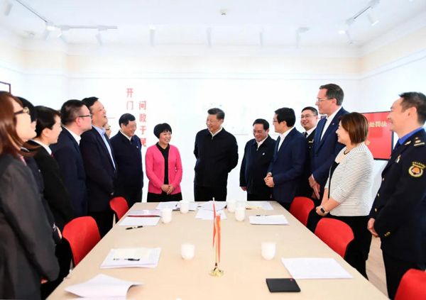 2019年11月2日,习近平总书记在上海市长宁区虹桥街道古北市民中心,同正在参加立法意见征询的社区居民代表亲切交流,并在这里首次提出“全过程民主”。摄影/新华社记者 谢环驰
