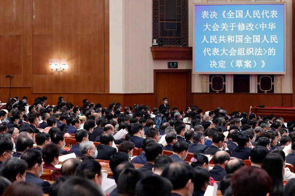 2021年3月11日,十三届全国人大四次会议通过修改后的全国人大组织法,将全国人大及其常委会“坚持全过程民主”写入法律。摄影/中新社记者 盛佳鹏