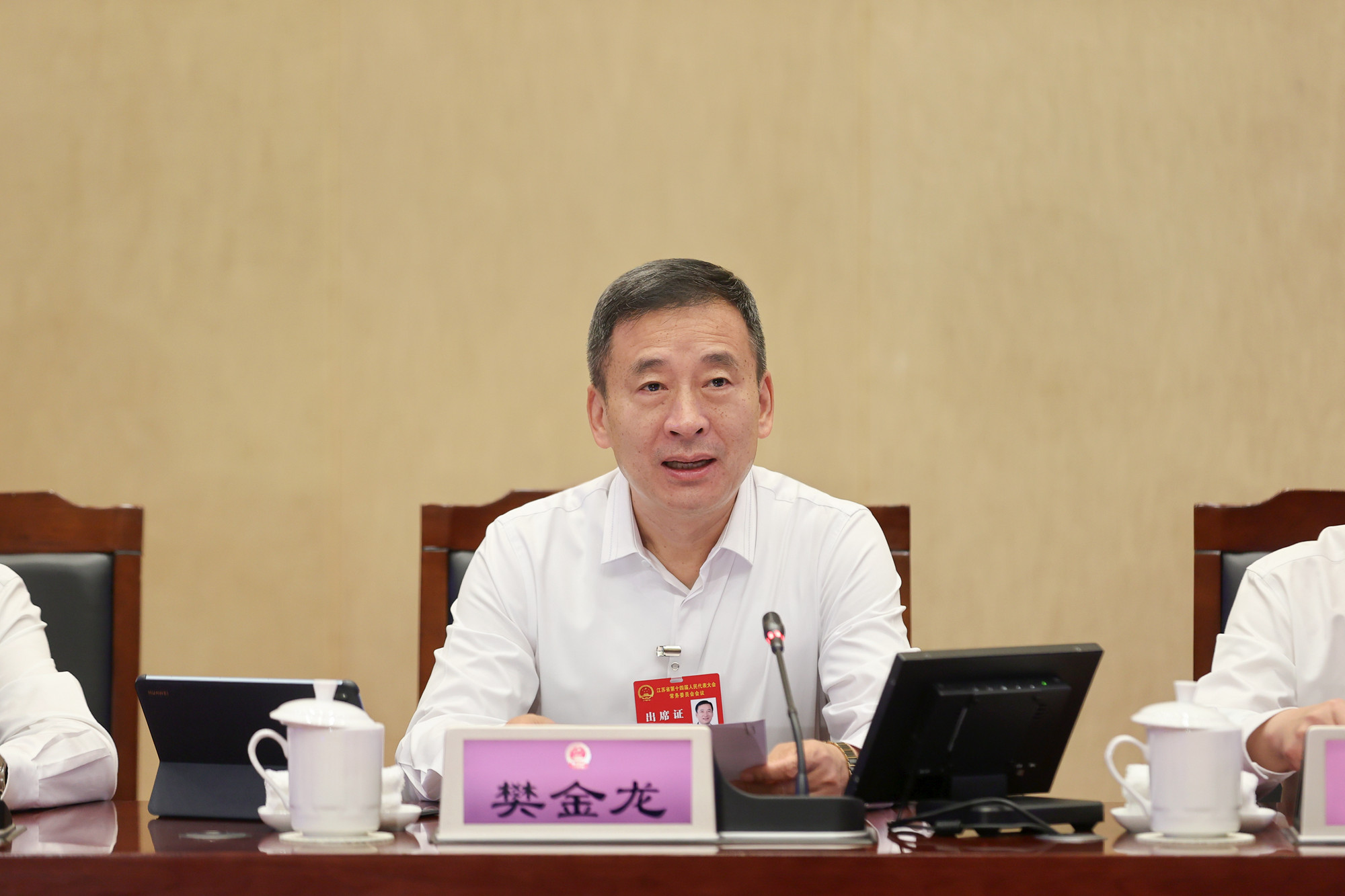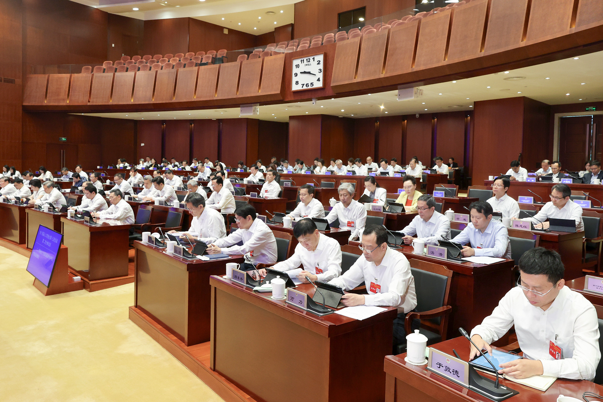 5月29日上午,省十四届人大常委会第十五次会议举行第二次全体会议,受省委书记、省人大常委会主任信长星委托,省人大常委会常务副主任樊金龙主持会议,副主任张爱军、魏国强、夏心旻、周广智、张宝娟和秘书长陈建刚出席会议。副省长李忠军、省法院院长夏道虎、省检察院检察长赵铁实,省监委负责同志列席会议。