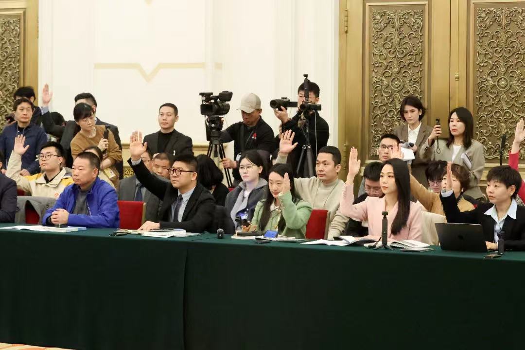 頂圖:3月7日上午,十四屆全國人大三次會議江蘇代表團舉行全體會議,本次全體會議向境內外記者開放。