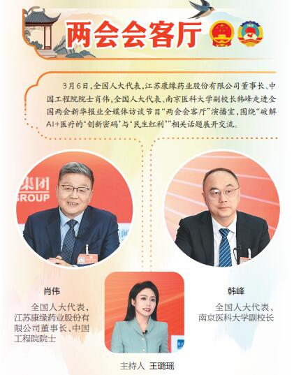 3月6日,全国人大代表,江苏康缘药业股份有限公司董事长、中国工程院院士肖伟,全国人大代表、南京医科大学副校长韩峰走进全国两会新华报业全媒体访谈节目“两会会客厅”演播室,围绕“破解AI+医疗的‘创新密码’与‘民生红利’”相关话题展开交流。