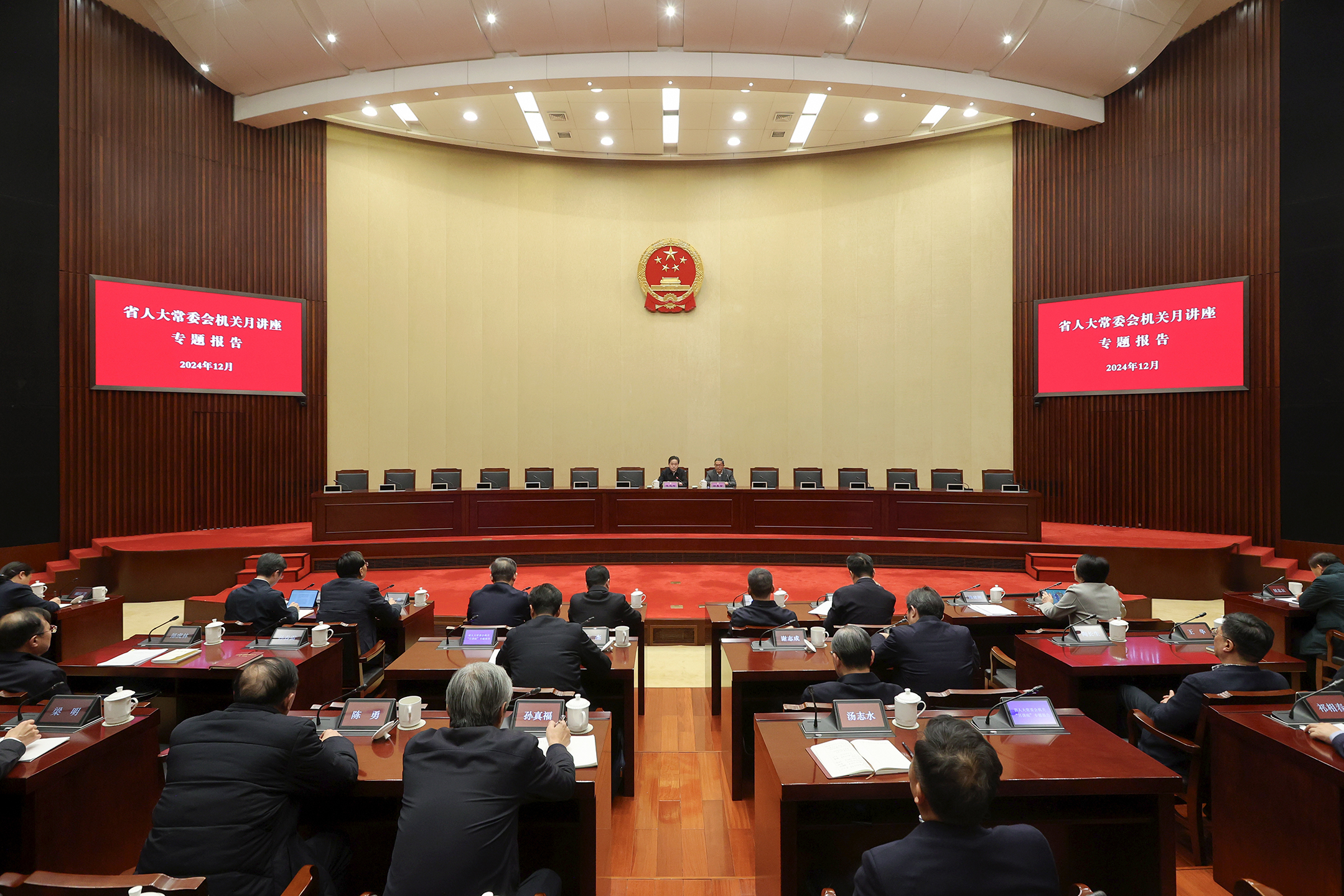 12月27日下午,省人大常委会举办12月份机关月讲座专题报告会,省人大农业农村委副主任委员孙春雷和省人大常委会代表工作委员会副主任郜虎林分别作专题报告。省人大常委会秘书长陈建刚主持。