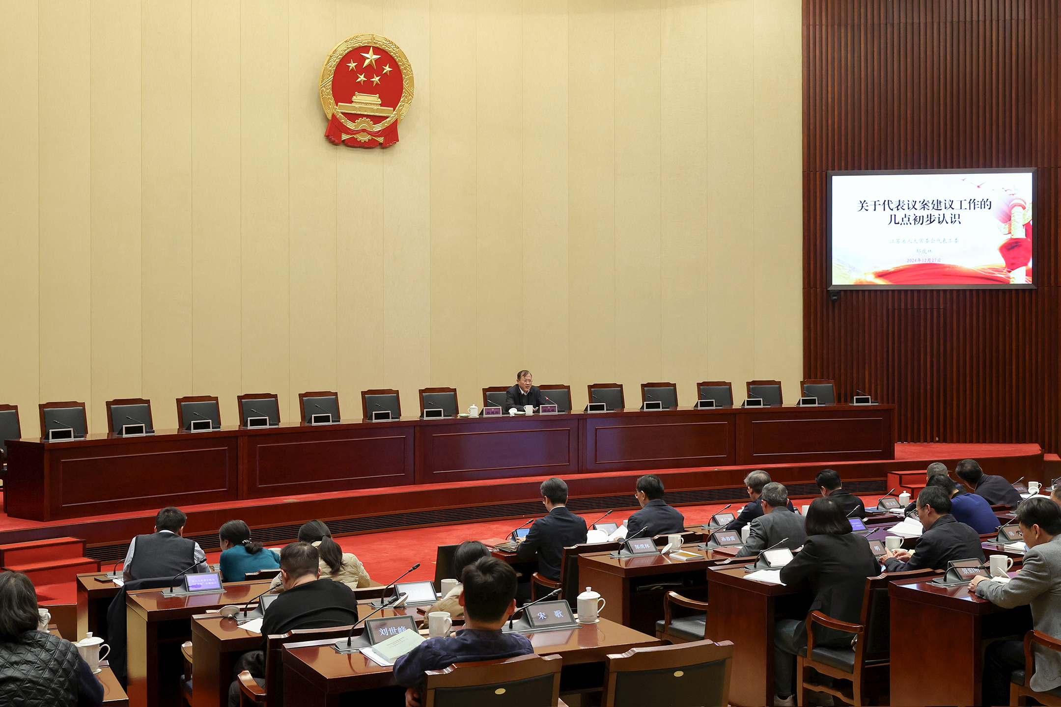 郜虎林从坚持和完善人民代表大会制度,践行全过程人民民主的高度,阐述了人大代表议案建议的内涵、性质和相关制度机制的建立发展,介绍了省人大代表议案建议工作现状,按照“内容高质量、办理高质量”和“既要重结果、也要重过程”要求,从提、交、办、督、评五个环节,提出了进一步提高代表议案建议工作质效的思路举措,对省人大机关如何协同做好代表议案建议工作谈了深刻认识。