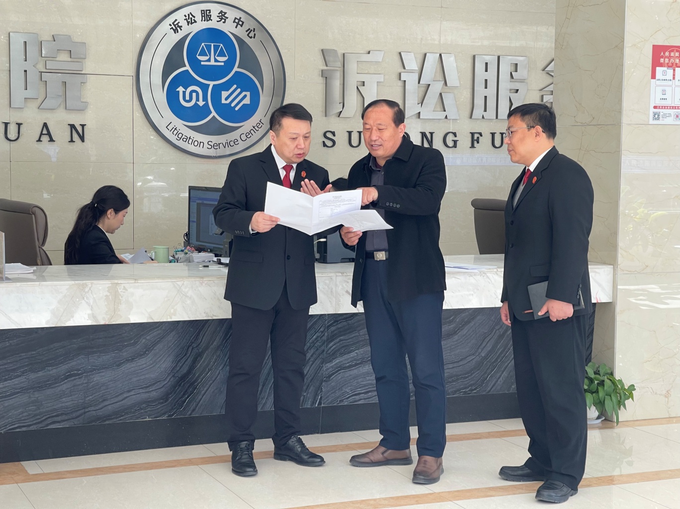 全国人大代表杨永(中)在徐州市贾汪区法院诉讼服务中心了解民事起诉状示范文本。 杨青 摄