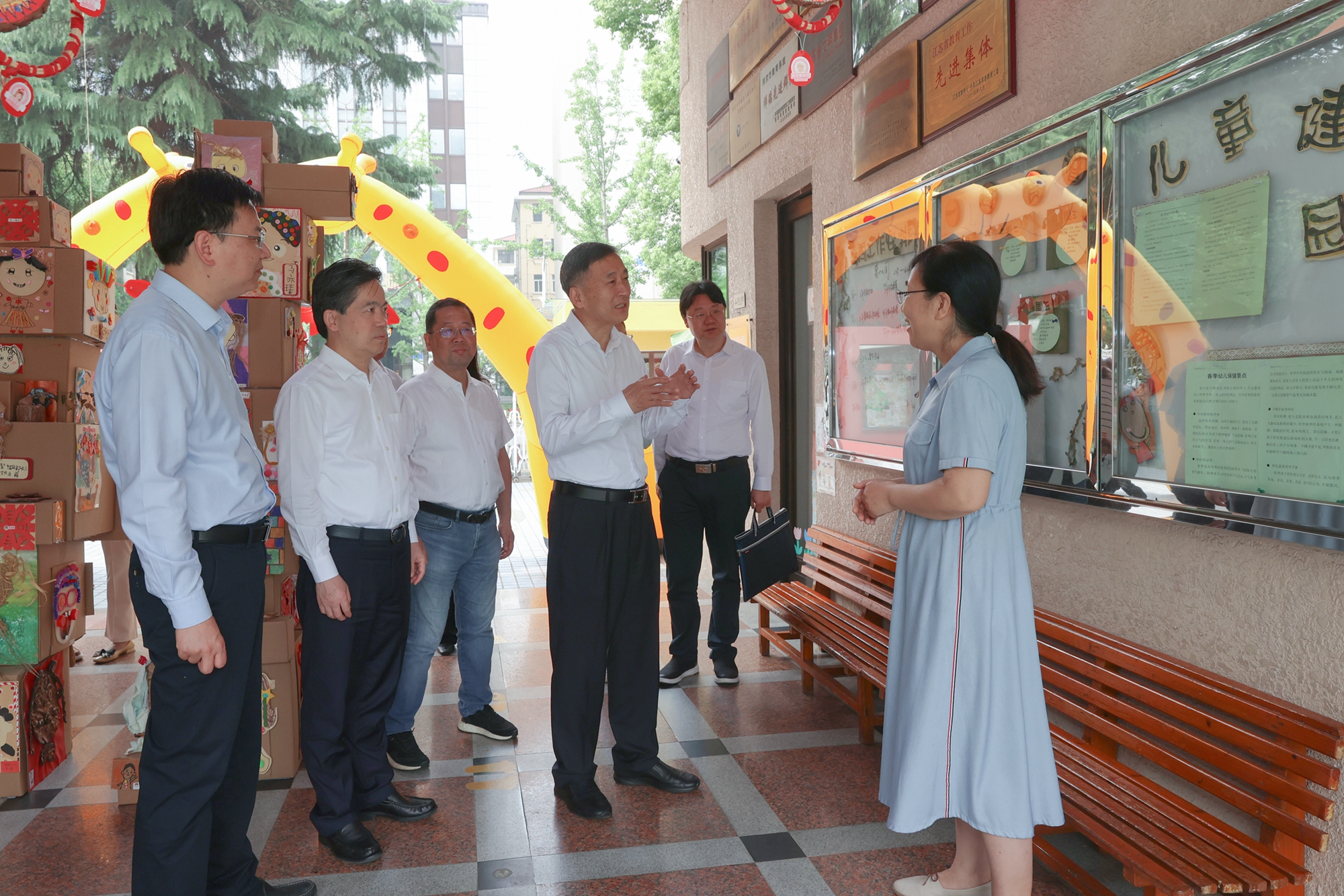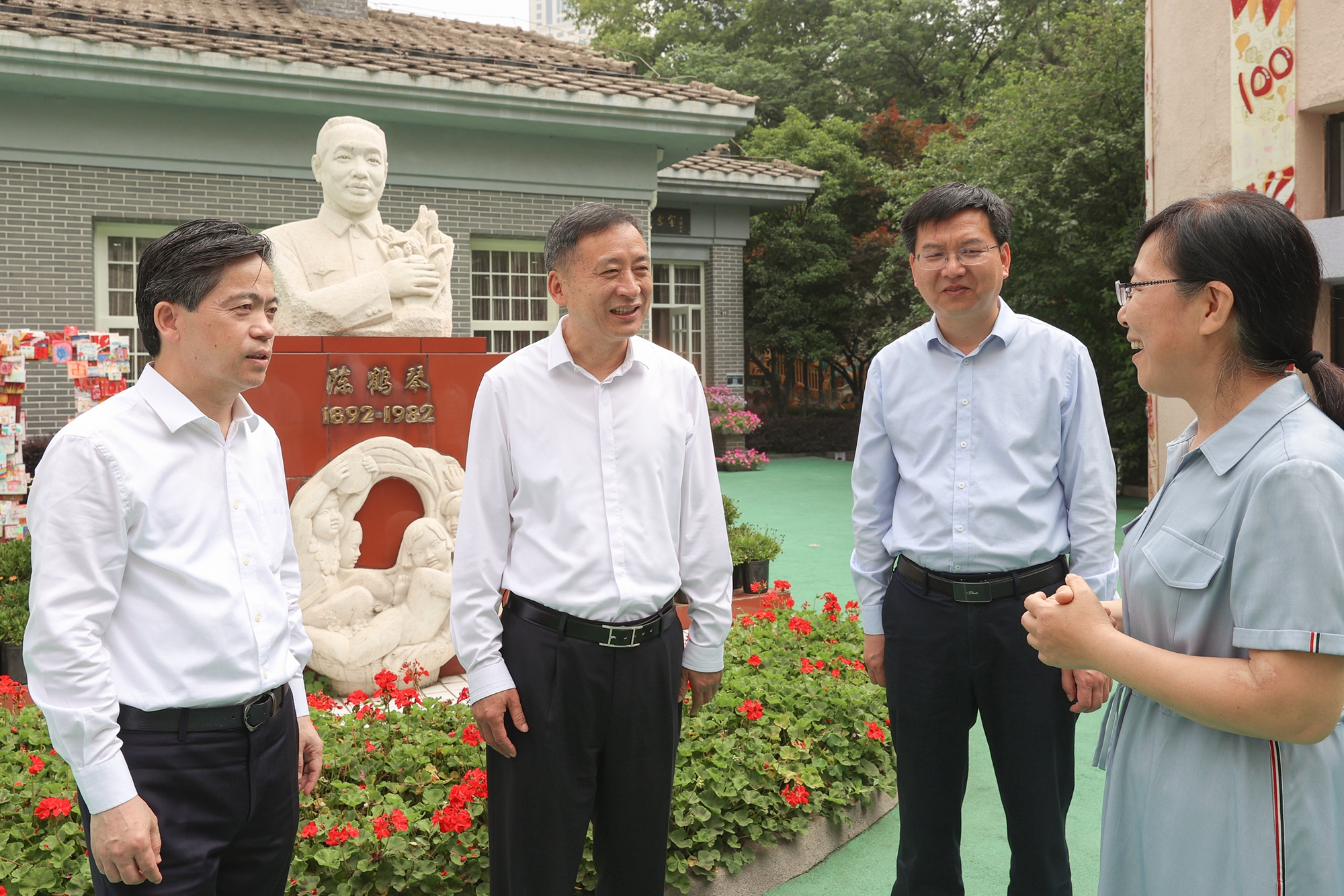 来到私立鼓楼幼稚园旧址,樊金龙一行走进鼓楼幼儿园园史室和陈鹤琴纪念室,一幅幅历史照片、一件件珍贵实物、一张张证书奖状,展示着鼓楼幼儿园办学历程和教育成果。樊金龙说,鼓楼幼儿园是由著名教育家陈鹤琴于1923年创办,是中国历史上第一所开展教育科学研究的幼儿园,至今已走过百年;陈鹤琴先生还曾担任过江苏省人大常委会副主任,鼓楼幼儿园与省人大更是有着一份特殊的缘份。100年来,鼓楼幼儿园始终秉持陈鹤琴先生“一切为儿童”“中国化、科学化、大众化”的办园理念,积极探索幼儿教育工作的规律和特点,形成了一批行之有效的教学成果,希望在园长的带领下,全体教职员工能够继续发挥深厚历史积淀优势,创新教育实践和经验,推动幼教水平不断提升、取得更大进步。