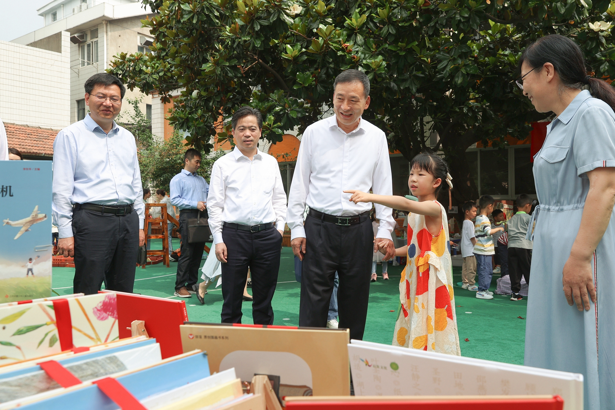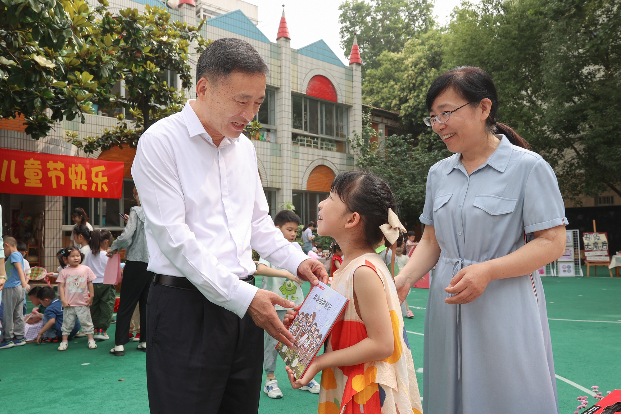 操场上,幼儿园正在举办游戏节,孩子们欢快地做着各种游戏。“换了几颗牙了?”“最喜欢幼儿园的哪个菜呀?”“最喜欢读什么书呀?”樊金龙与小朋友亲切交谈,详细询问他们在园的学习和生活情况,并向儿童代表赠送图书和玩具。当听到孩子说最大心愿是第一批加入少先队时,樊金龙非常高兴,祝福她快乐学习、健康成长,争取早日实现自己的愿望。