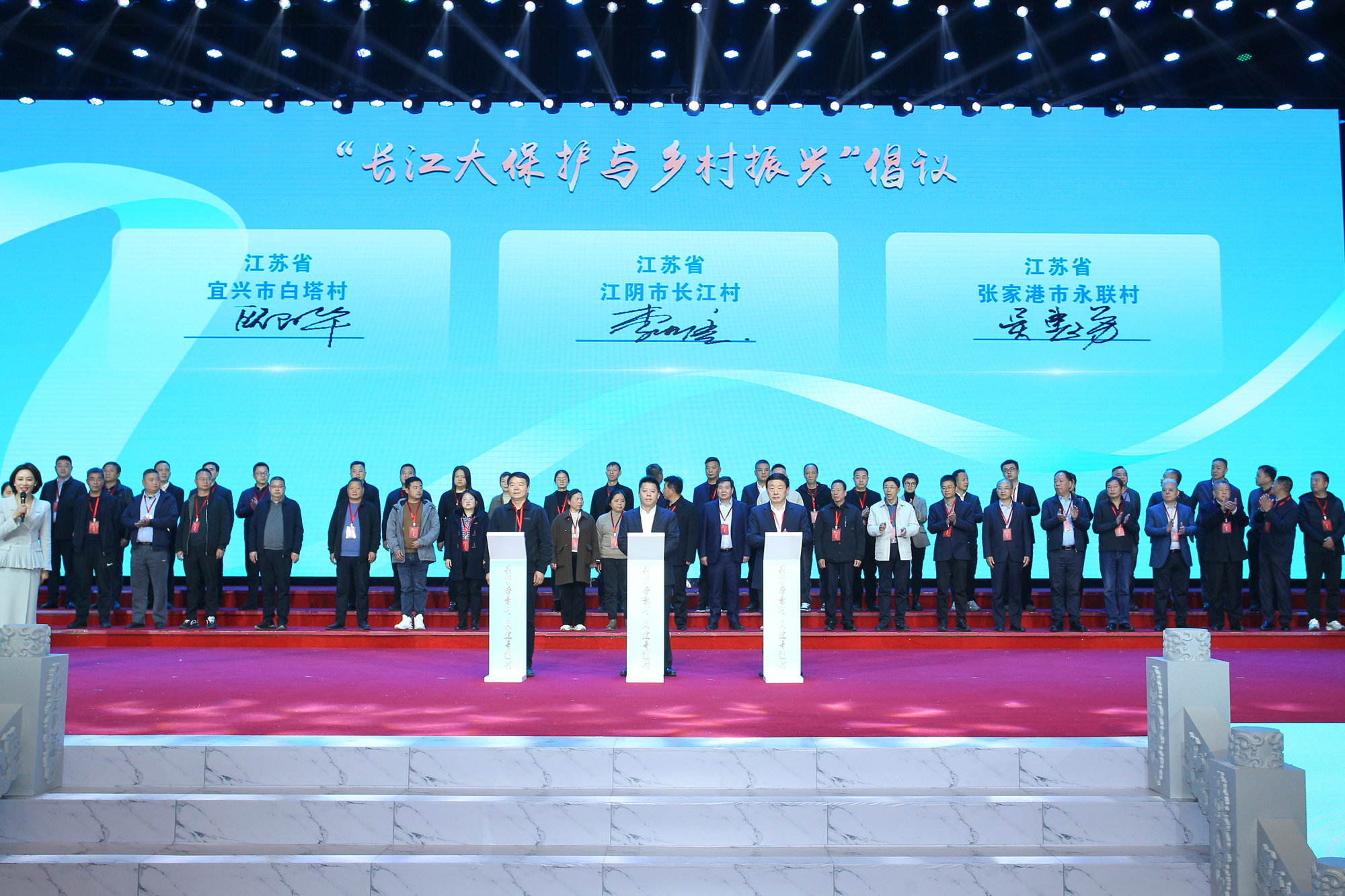 座谈会上,由全国人大代表、江阴市长江村党委书记李洪耀,全国人大代表、张家港市永联村党委书记吴惠芳,全国人大代表、宜兴市白塔村党总支书记欧阳华等发起的长江大保护与乡村振兴百村倡议书正式签署,沿江11个省份的近百个村庄共同倡议:坚定不移以习近平生态文明思想为指引,深入学习贯彻党的二十大精神,做到党建引领、村庄联动,保护为本、振兴产业,依法为民、和谐共生,治理创新、共治共建,对接帮扶、共富共享,在构建人与自然和谐共生的中国式现代化新征程中,共建生命长江、传承大河文明,为子孙后代留下一个美丽、和谐、绿色的长江。