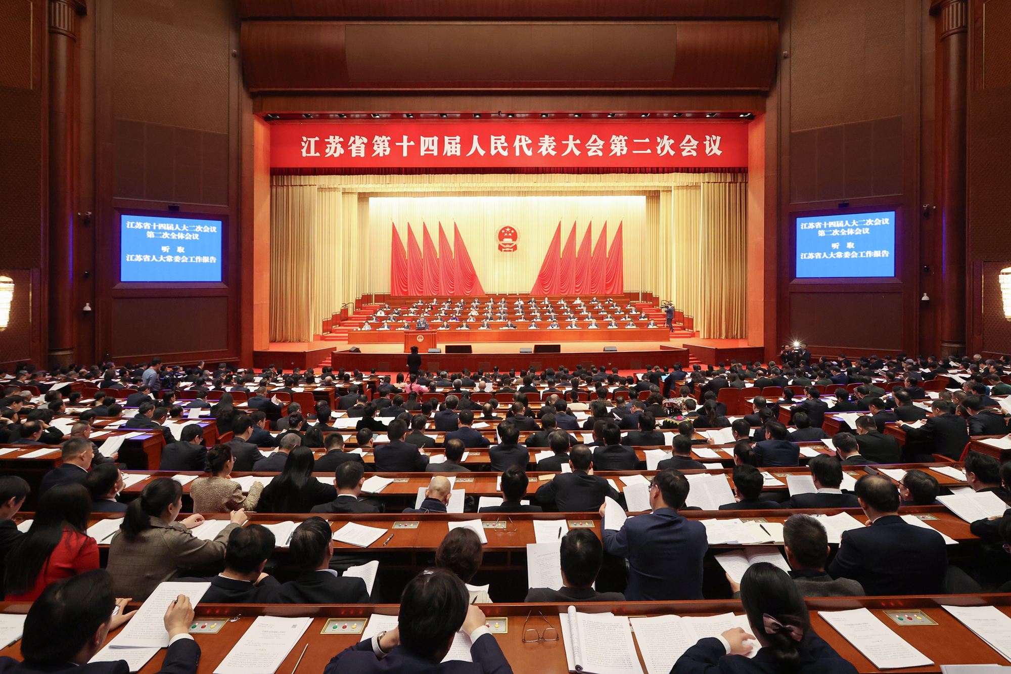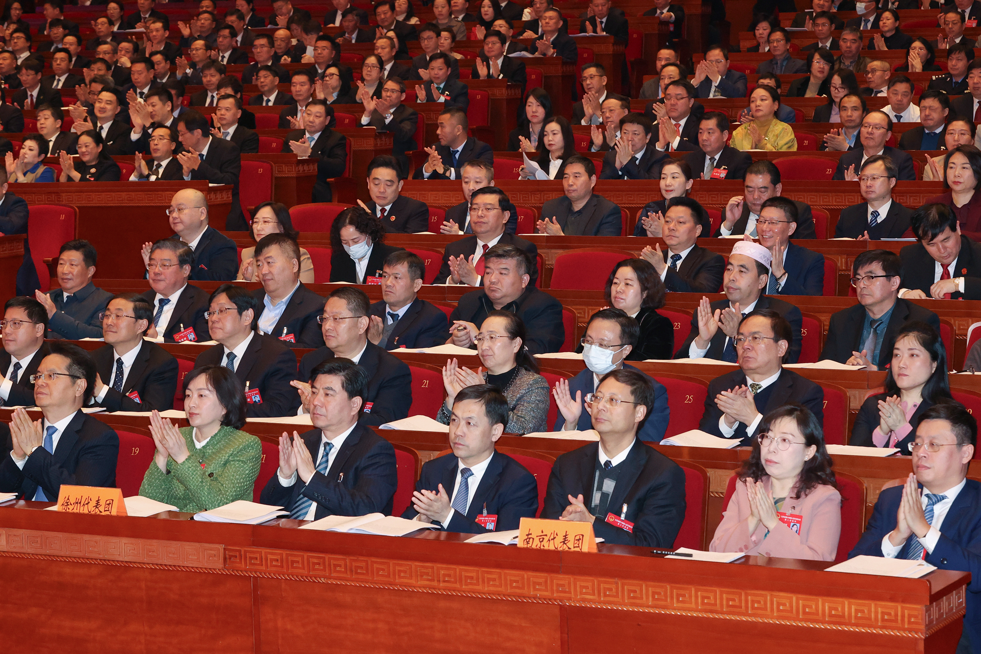 樊金龙从扎实开展主题教育,牢牢把握人大工作正确政治方向;精心组织学习实践活动,充分发挥人大代表主体作用;深入践行全过程人民民主,稳中求进提升人大工作水平;服务大局履职尽责,更好推动经济社会高质量发展;注重密切协同上下联动,不断增强人大工作整体合力等五方面回顾了过去一年的主要工作。一年来,省人大常委会深入学习习近平新时代中国特色社会主义思想,以党的创新理论凝心铸魂,进一步完善并严格执行向省委请示报告制度。创设“人大代表讲坛”,基本实现新一届基层一线省人大代表学习培训全覆盖。及时将太湖水污染防治条例执法检查增列为年度重点监督项目。研究出台关于进一步提高省人大常委会会议审议质量的12条规定。组织开展“牢记嘱托、感恩奋进”学习实践活动,推动各级人大及其常委会和近10万名五级人大代表学思践行。本届人大五年立法规划向全社会征集项目建议478件,就食品安全条例征集各方面意见建议3200多条,针对道路交通安全条例的关键条款开展立法听证。聚焦助力推动经济运行率先整体好转,专门安排18个经济方面监督项目。首次听取审议省政府3项重大决策出台前的报告,首次听取“一府两院”4名负责人履职情况报告并开展评议。在20个全国和省人大代表所在企业创设经济运行观察点。服务中心大局,围绕聚力科技自立自强、服务构建新发展格局、助力农业现代化、推动美丽江苏建设、促进民生保障和基层治理、推进文化强省建设充分发挥职能作用。开展贯彻落实中央人大工作会议精神和省委人大工作会议部署要求专项督查,相关工作取得积极成效。积极构建立法监督项目共同推进、突出问题共同解决、代表作用协同发挥的省市人大联动工作机制,去年提出助推经济运行率先整体好转等10个方面联动事项并抓好落实。