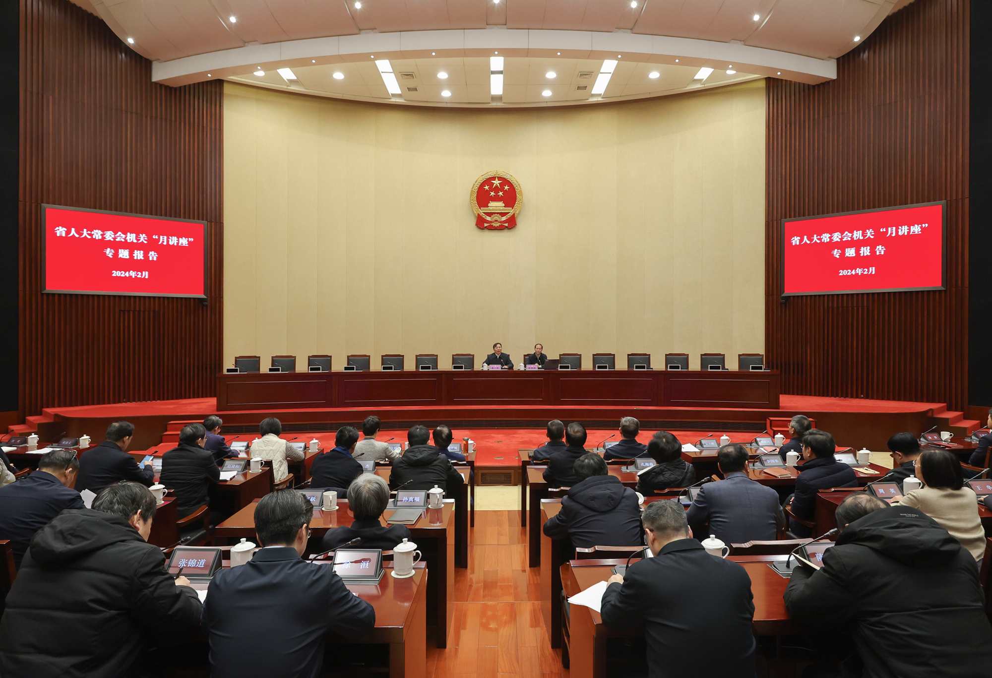 2月29日上午,省人大常委会举办机关理论学习“月讲座”专题报告会。省人大常委会副秘书长、研究室主任秦一彬主持,省人大教科文卫委副主任委员水家跃,省人大环资城建委副主任委员蔡任杰分别作专题报告。