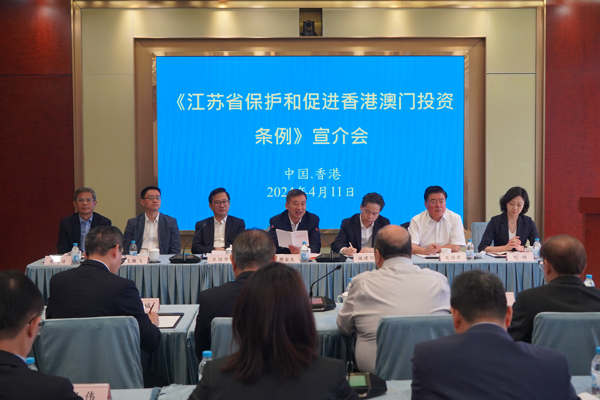 近日,省人大常委会常务副主任樊金龙率代表团访问香港、澳门。代表团分别于4月9日、11日在澳门中华总商会、香港江苏中心召开座谈会,就《江苏省保护和促进香港澳门投资条例》与港澳工商界人士座谈,推动深化交流合作。樊金龙出席座谈会并讲话,省人大常委会秘书长陈建刚参加。