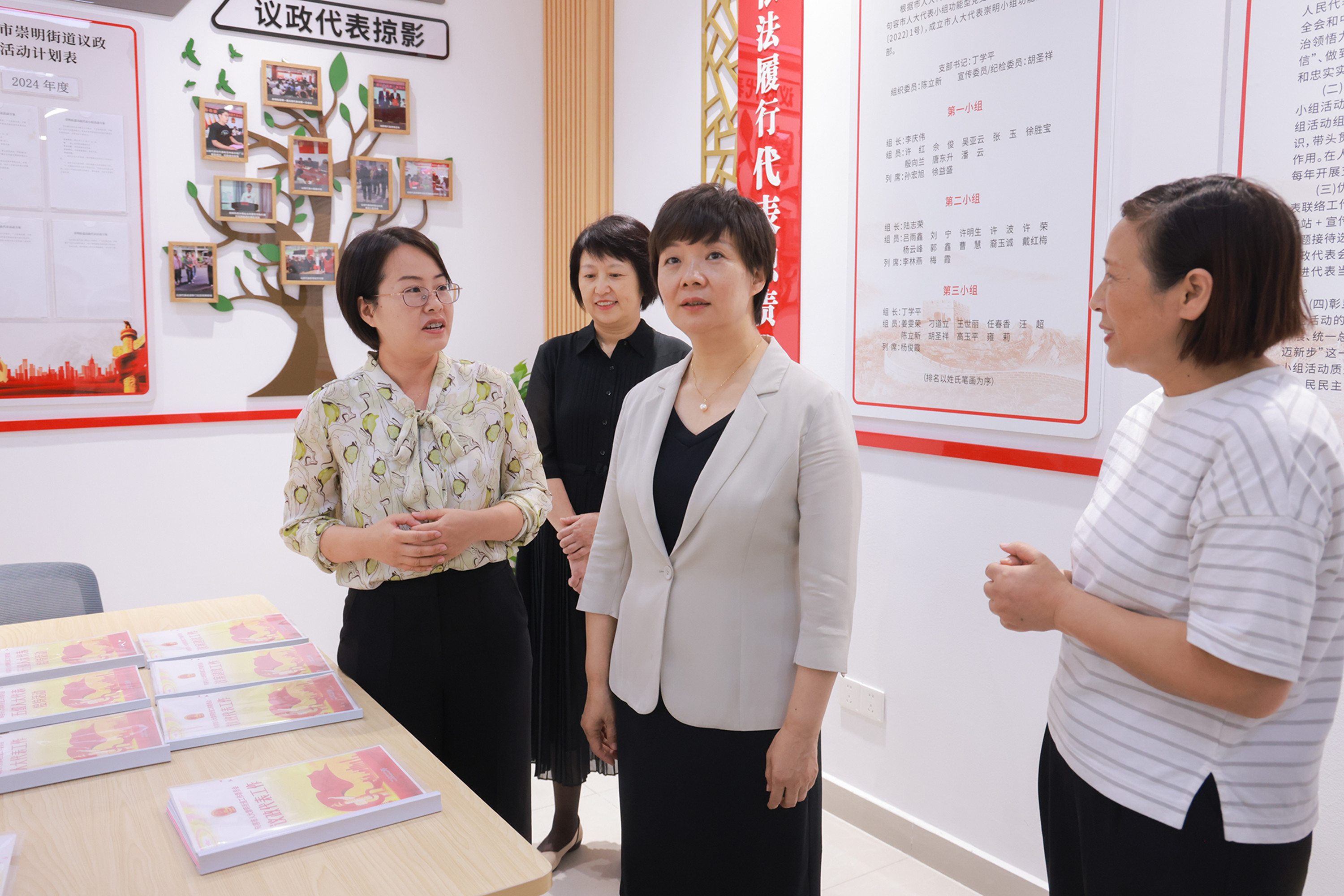 在镇江市西津渡全过程人民民主实践中心和金山街道实践站,张宝娟详细了解了人大代表密切联系群众、广泛收集民情民意、推动解决民生实事情况。随后,张宝娟实地调研句容崇明街道全过程人民民主实践单元,看望了省人大代表、白兔镇致富果业专业合作社社长张奎峰,省人大代表、句容开发区中心小学校长唐婉,实地走访了句容市人大常委会机关,了解机关干部工作情况,与镇江市人大和句容市人大围绕“丰富人大代表联系人民群众的内容和形式”和“健全人大协商制度化平台”两个专题进行座谈交流。