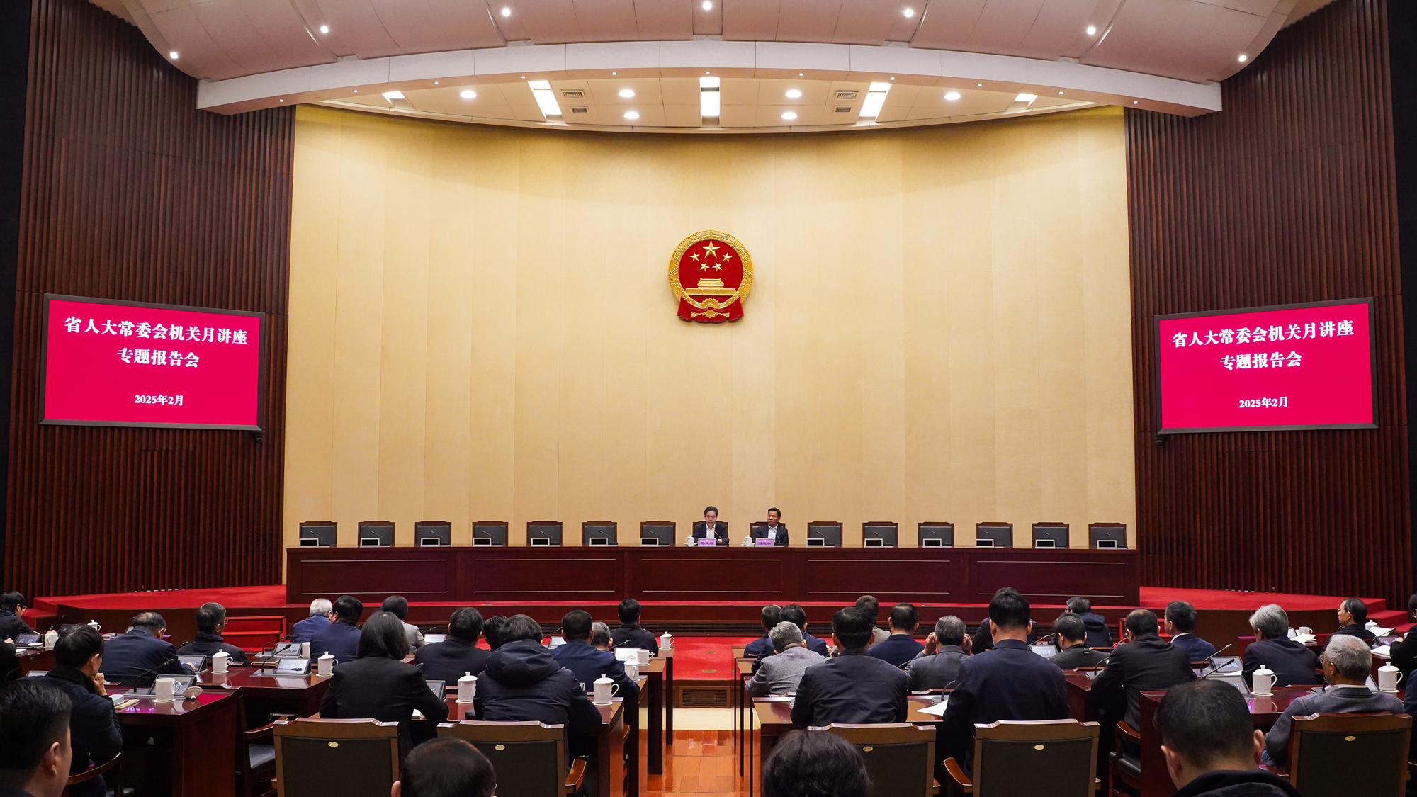 本届以来,结合开展“牢记嘱托、感恩奋进”学习实践活动,省人大常委会建立健全了“党支部周学习、专工委半月谈、全机关月讲座”学习制度,主任会议成员、各委厅室负责同志带头宣讲36场,推动机关干部增强感知大局、融入大局、服务大局的能力本领。2月26日上午,省人大常委会举办2025年度首场机关月讲座专题报告会,常委会预算工委副主任汤志水、社会委副主任委员万力分别作专题报告。省人大常委会秘书长陈建刚主持。