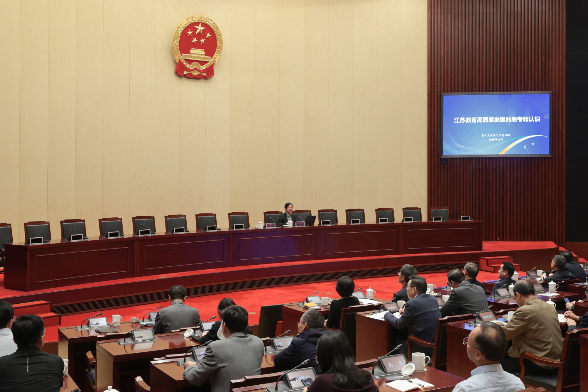邵进以“江苏教育高质量发展的思考和认识”为主题,梳理了我国教育发展的历史脉络与理论演进,解读了习近平总书记关于教育工作重要论述的精神实质、实践要求和“十五五”规划《建议》的最新精神,重点以高等教育为例,对江苏高校规模、质量、科创成果、顶尖人才、产学研转化等各方面数据进行横向对比与案例展示,具体分析了我省高等教育的基础优势与进步空间,并介绍了近年来开展教育立法工作所取得的成效和下一步计划。