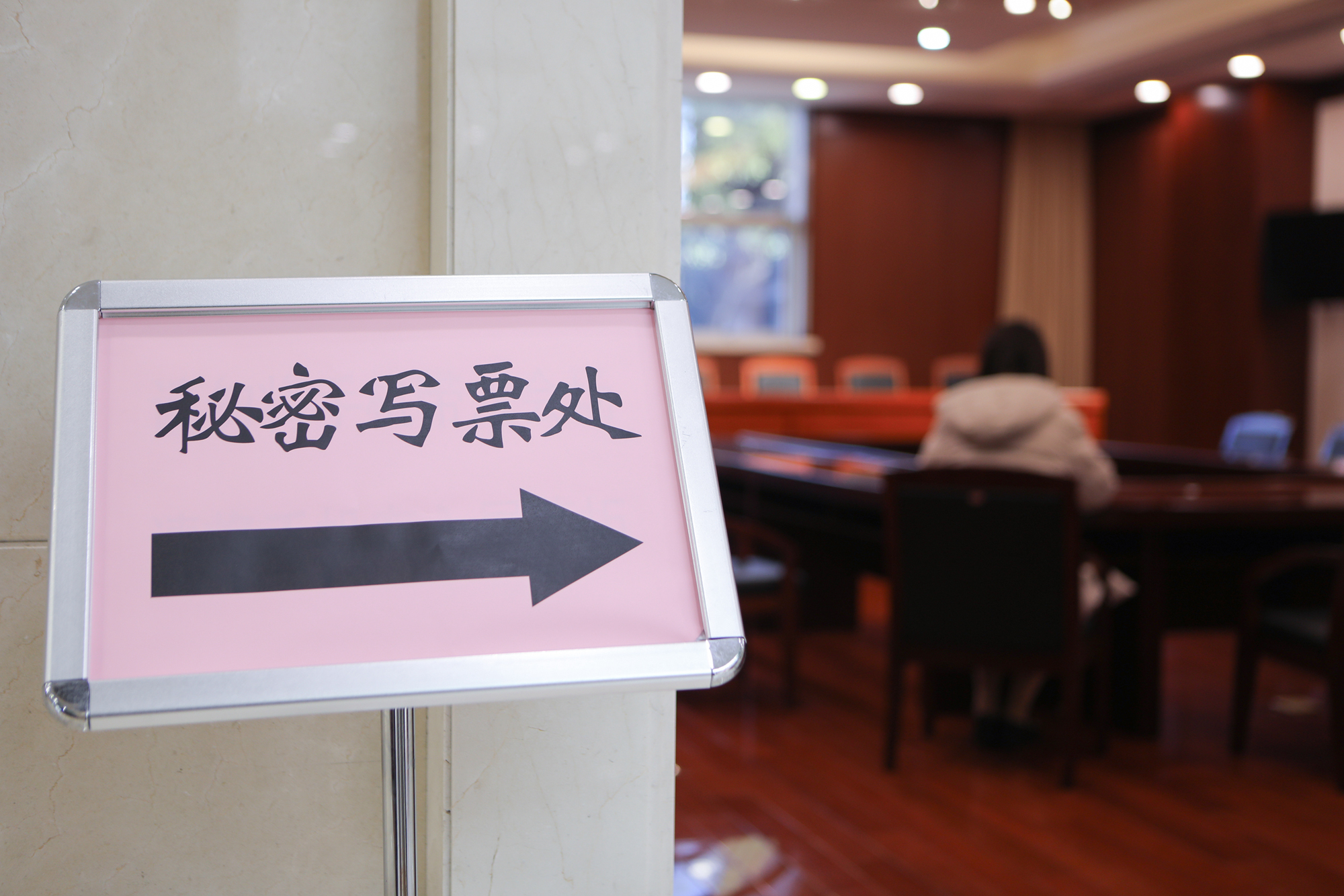 投票站内气氛庄重严肃、设置井然有序。五星红旗鲜艳夺目,悬挂正中,三个投票箱呈品字型端立前方,票箱上镶嵌的国徽熠熠生辉,验证处、领票处、写票处、秘密写票处分区设置,印有三名正式代表候选人基本情况的展板摆放醒目,方便选民了解情况。