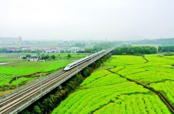在江西省吉安市峡江县水边镇佩贝村,高铁列车飞驰在广阔的绿色田园间。新华社发
